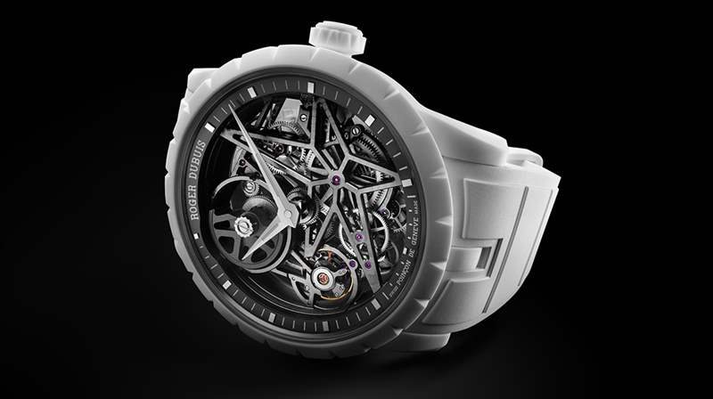 Excalibur MCF Blanc腕表是羅杰杜彼探索各種材料使用的延續(xù)。2020年,該品牌推出了Excalibur Twofold,其外殼具有由礦物復合纖維MCF制成的特殊性。這種99.95%二氧化硅的材料是制表技術(shù)中的第一。它因其超白顏色和抗侵略性紫外線而特別有吸引力。其相當輕的重量,比碳少13%,使其同樣具有吸引力。由非常穩(wěn)定的樹脂制成,加工起來要容易得多。憑借這種美學和實用品質(zhì),在日內(nèi)瓦制表師的作品中找到MCF的可能性很高。因此,它應(yīng)該形成這個新的88枚限量系列腕表Excalibur MCF White的42毫米直徑表殼,這是很自然的。