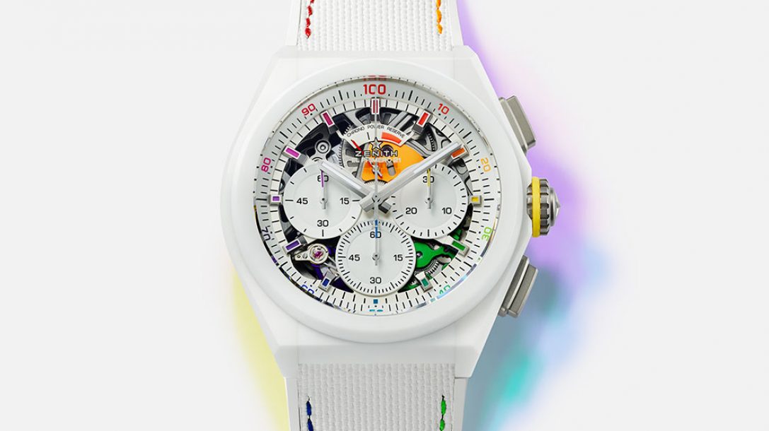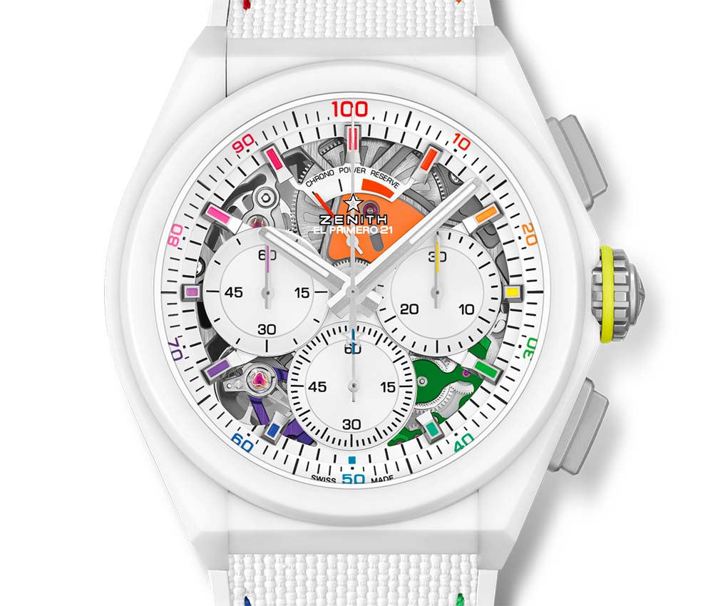 紅色、橙色、黃色、綠色、藍色、紫色和靛藍的點綴著標記和專用于1/100的比例千環繞鏤空表盤的秒數。在后者上,您可以找到計時碼表子表盤、9點鐘位置的小秒針和12點鐘位置的50小時動力儲存指示器。所有時間數據均由El Primero 9004機芯提供動力,該機芯由直徑44毫米的白色陶瓷表殼保護。該機械裝置是對傳奇的1969年自動上鏈機芯的現代演繹,具有兩個擒縱機構。一種是每小時振頻36,000次的手表,另一種是50 Hz高頻的計時碼表。