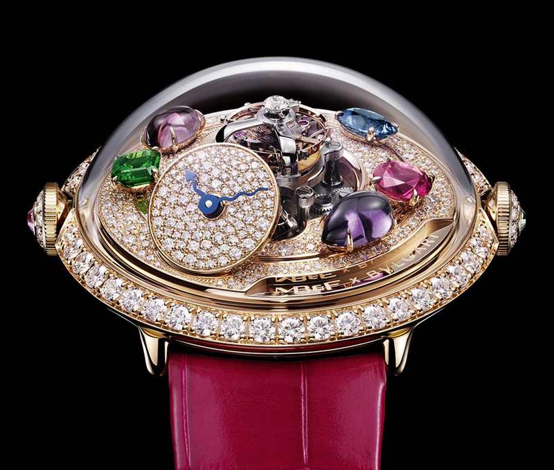 在藍寶石水晶氣泡下,一床鉆石擁有不同顏色和形狀的寶石。碧璽、紫水晶、沙弗萊石、拓帕石和紅碧璽以橢圓形、圓形或正方形的切工,圍繞著一根像動畫圖騰一樣上升的機械柱展開舞蹈。石材覆蓋的表盤似乎倚靠在這種垂直結構上,頂部是一個帶有鉆石鑲嵌框架的飛行陀飛輪。這個圓盤以50°的角度放置,由兩個藍色的蛇形指針飛過,允許其所有者謹慎地讀取時間。
