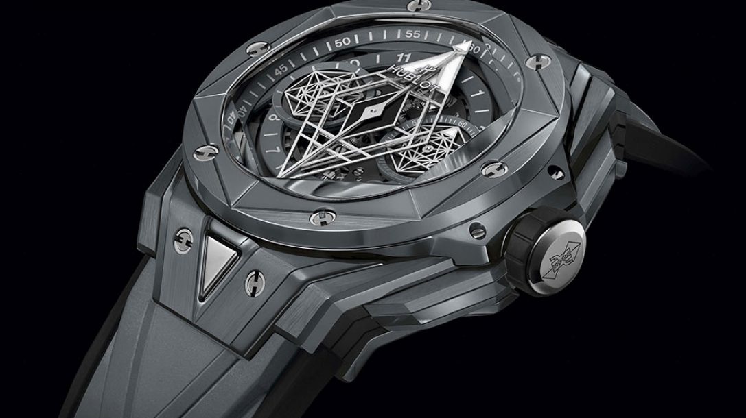 自2016年以來,由瑞士紋身藝術(shù)家兼創(chuàng)意總監(jiān)Maxime Plescia-Büchi和宇舶表創(chuàng)辦的著名雜志Sang Bleu建立了合作伙伴關(guān)系,旨在定期提出具有顛覆性設(shè)計(jì)的限量系列。每件作品都是基于直徑45毫米的大爆炸表殼的想象,該表殼具有重新詮釋的線條。今年,來自Nyon的制表師為Big Bang Sang Bleu II陶瓷三重奏注入了對(duì)材料的精湛技藝。顧名思義,這些時(shí)計(jì)的表殼采用陶瓷制成,陶瓷經(jīng)過著色,并以緞面拉絲和拋光表面襯托。但還有更多即將到來,因?yàn)榭堂媪切伪砣途牡窨痰谋肀P也是這種材料的中心舞臺(tái)!白色,藍(lán)色或灰色色調(diào)在這種風(fēng)格化的三維幾何場(chǎng)景設(shè)計(jì)中占據(jù)著至高無上的地位,其中令人驚訝的手,兩個(gè)錠劑和一個(gè)箭頭懸停在時(shí)間數(shù)據(jù)上。同樣,交織的線條確保小秒針和累加器從雙復(fù)合定位計(jì)時(shí)碼表中脫穎而出。
