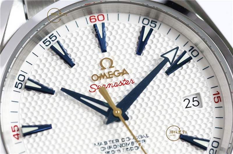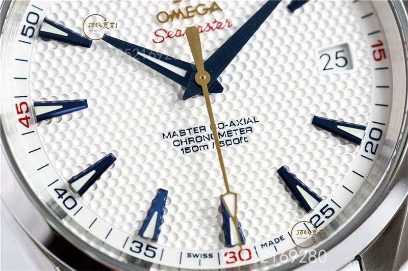 這款海馬系列Aqua Terra“萊德杯”限量版腕表配備銀色表盤,裝飾獨特的高爾夫球狀構(gòu)造。三角拱形藍(lán)色時針、分針以及小時刻度搭配18K黃金秒針。在表盤上其他地方,分鐘圈上裝飾少許紅色元素,還帶有紅色“Seamaster”系列名稱。白色、藍(lán)色、金色與紅色搭配呼應(yīng)“萊德杯”世界所有色彩組合。顏色絢爛,這是此款腕表的一大特點,也是作為復(fù)刻表的一大難點,在外殼以及機芯上,VS是有購入同類型腕表正品開具的模具,所以外殼以及機芯是一致的,但是盤面的顏色雖然色質(zhì)一樣,但是色值不同,看起來總覺得暗淡了一些或者說無神了一些,筆者認(rèn)為這是兩者最大的差異,但是也是要在對比的情況下看的出,沒有對比,只是看起來晦澀一些,沒有那種顏色的色感。從顏色的角度上來說,筆者認(rèn)為這款表還是略有色差。(擴展鏈接:VS廠歐米茄海馬150m復(fù)刻表做工評測及全系列介紹)