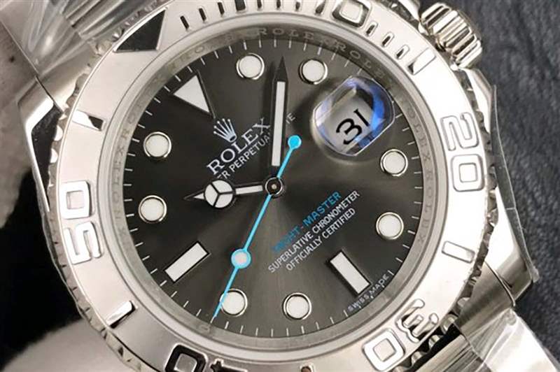 AR廠勞力士灰游艇名仕系列灰盤藍針復刻腕表盤面由灰色的金屬放射紋構成,盤面之上散布大三針加上日歷的簡略結構、秒針為藍色,12點位設置logo信息、3點位設置日期顯示功用、6點位篆刻品牌文字信息、盤面一切時標刻度均為勞力士條釘和圓釘標識,指針和一切刻度均選用精巧的夜光填充作用。