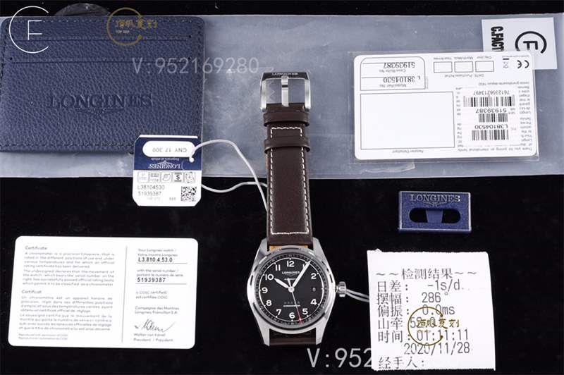 【品控】CF團隊近乎苛刻的嚴謹品控,每枚機芯的品控從源頭出發,每一只腕表出廠前都經CF制表師調試至最佳狀態并附帶機芯檢測報告單一份,隨表附送正品一致的頭層牛皮皮套與五碼合一。 CF始終堅持初心,追求完美!將持續為各界表友打造原單品質的浪琴腕表副本。CF廠只做浪琴的工匠工廠!